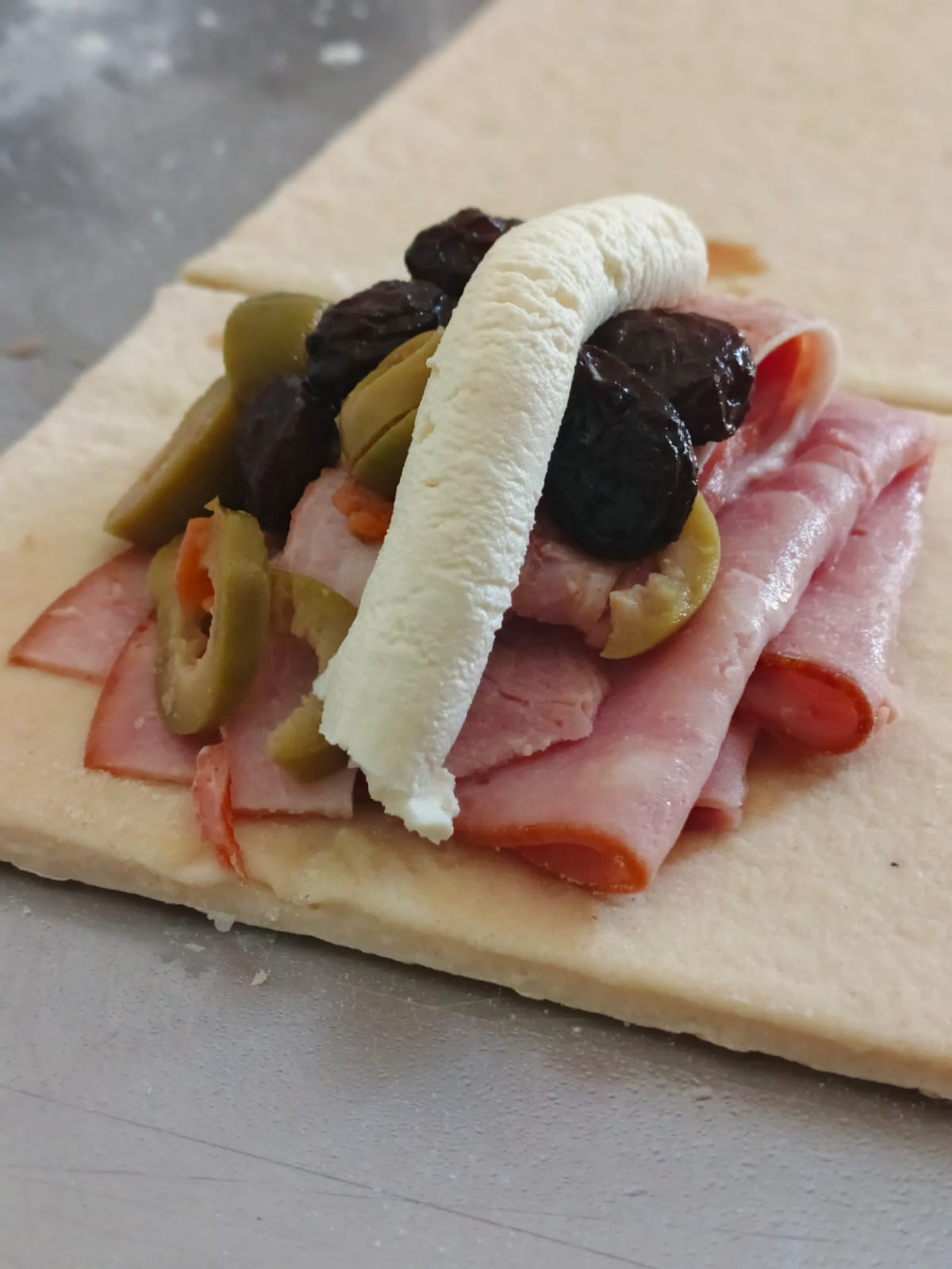 Relleno especial de jamón, lomo de cerdo ahumado, tocineta, pasas, aceitunas y queso crema, envuelto en hojaldre dorado.
