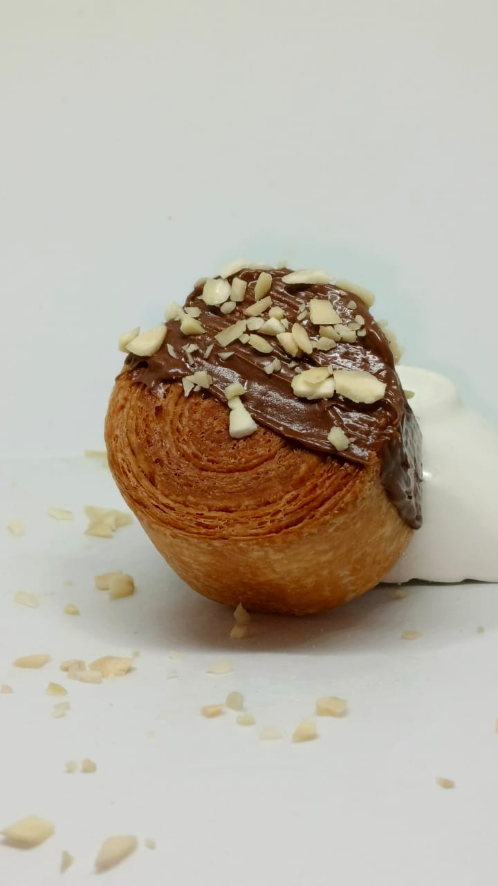 Deliciosa masa danesa rellena de Leite Creme, bañado en una suave salsa de avellana y decorado con crocantes trocitos de almendra. ¡Una experiencia irresistiblemente avellanada!