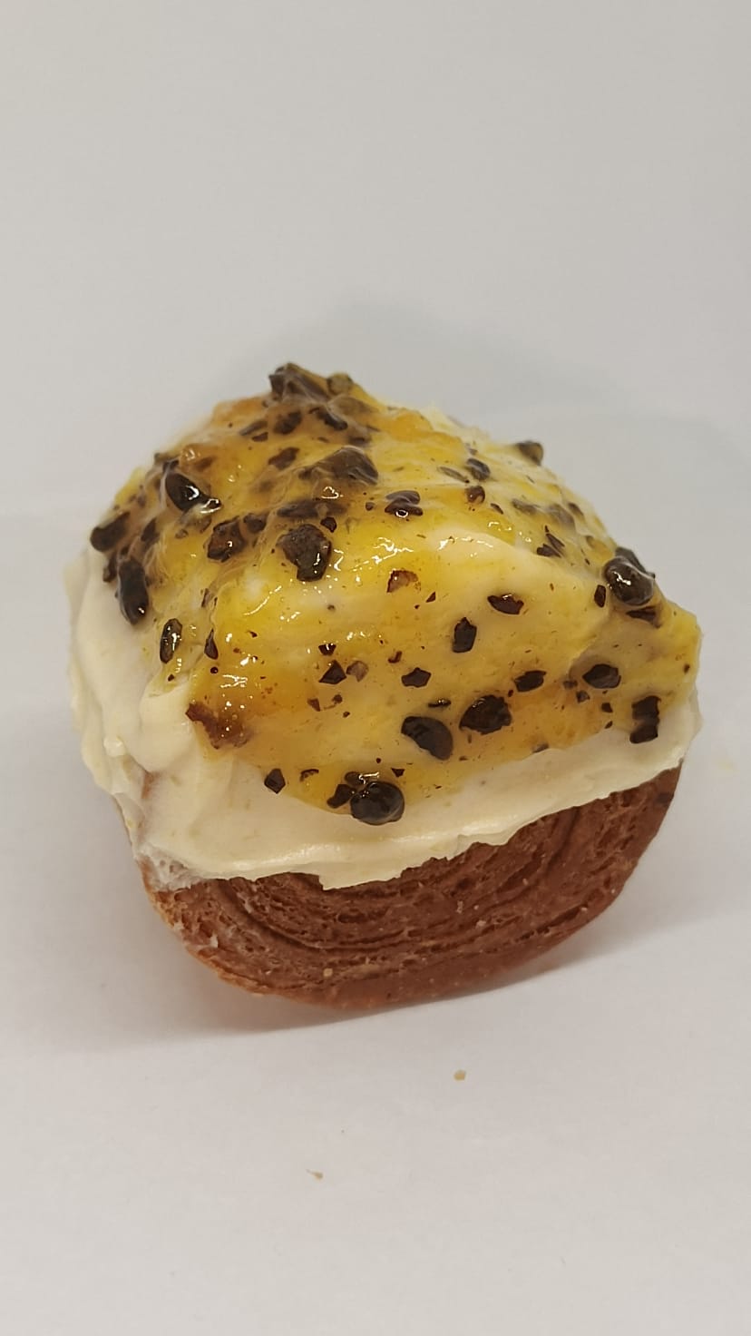 Exótica masa danesa con un refrescante relleno de Leite Creme, cubierto con ganache de matacuyá y decorado con mermelada de maracuyá para un toque tropical.