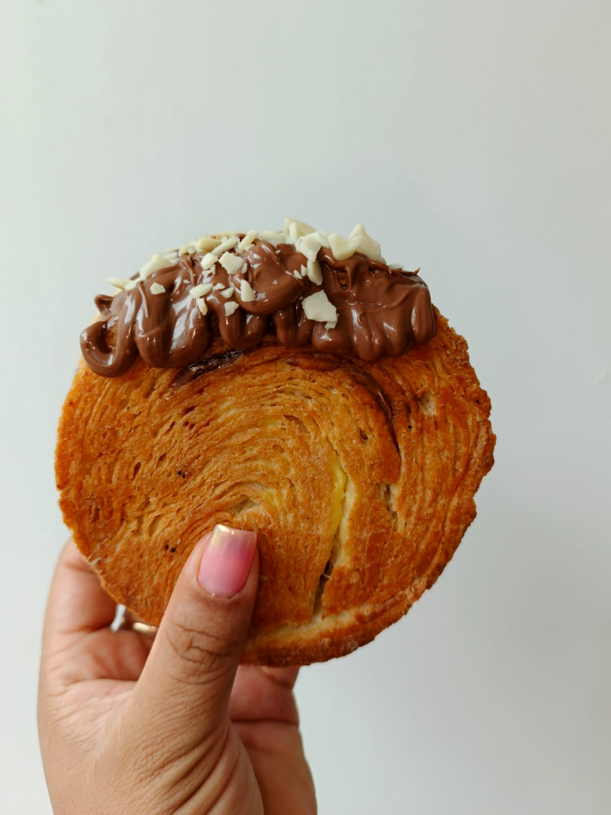 Deliciosa masa danesa rellena de Leite Creme con crema de avellana, bañado en una suave salsa de avellana y decorado con crocantes trocitos de almendra. ¡Una experiencia irresistiblemente avellanada!