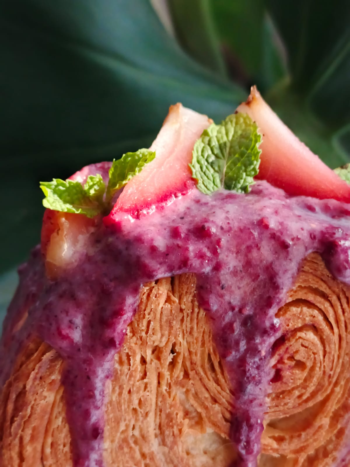 Una explosión de sabor con nuestra masa danesa rellena de Leite Creme, bañado ganache de frutos rojos decorado con mermelada de frutos rojos.