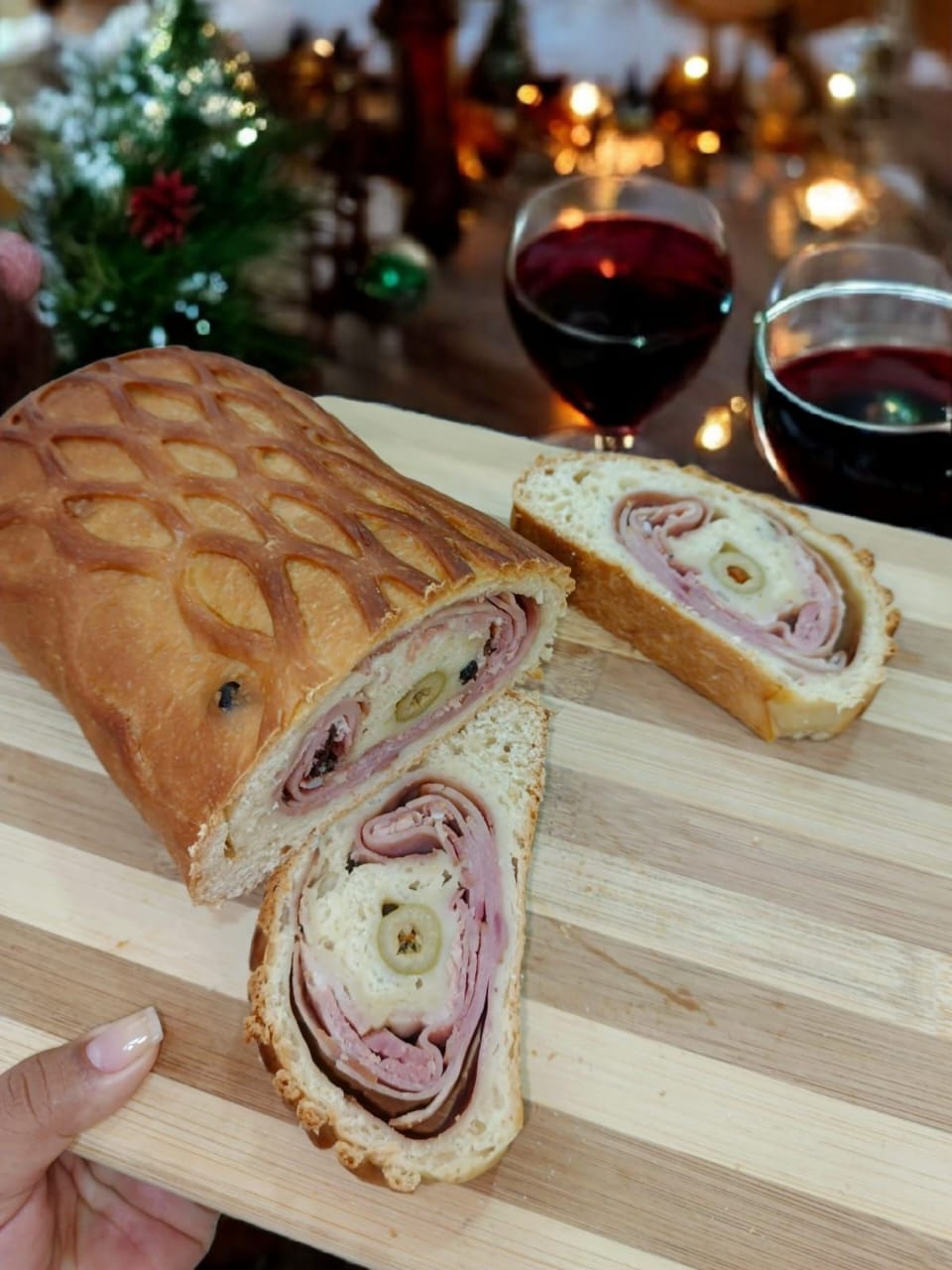 Sumérgete en la magia de nuestro pan de jamón con masa brioche, suave y esponjosa. una mezcla perfecta de dulzura, jamón, aceitunas, pasas y tocineta, con ese sabor tradicional y festivo